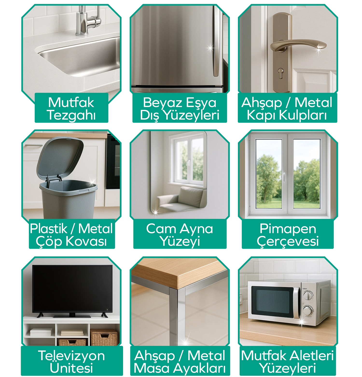 - Metal Yüzeyler: Buzdolabı, fırın gibi beyaz eşyalar üzerinde parlak temizlik sunar.