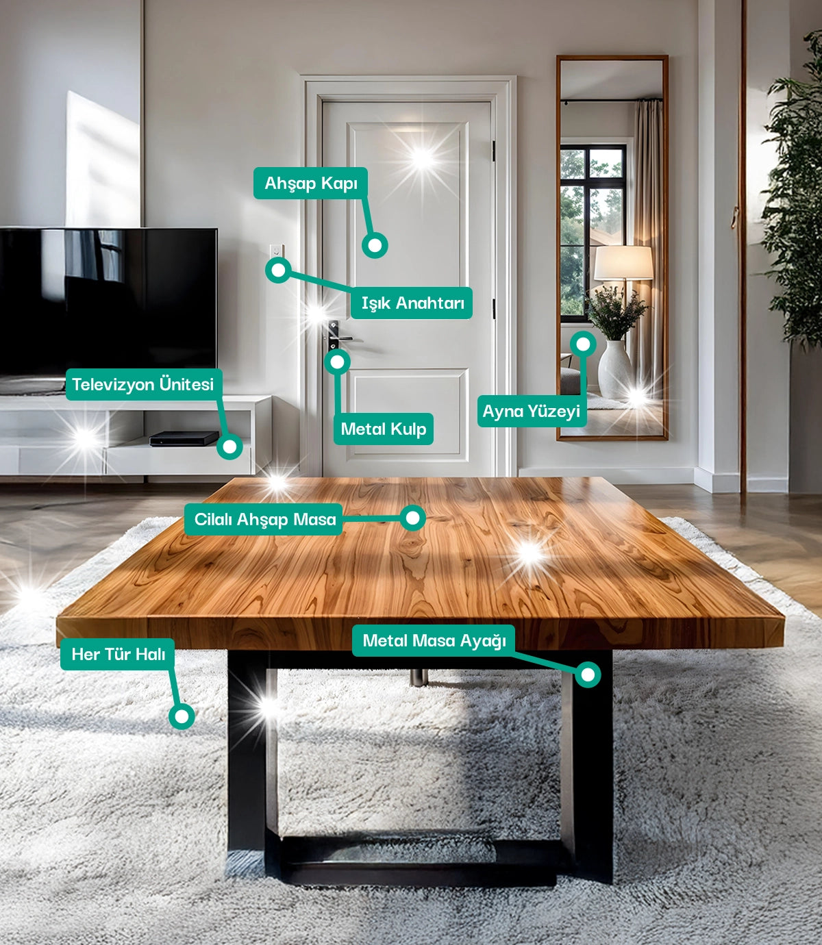 - Ahşap ve Mobilya: Toz, parmak izi ve kirleri yüzeye zarar vermeden giderir.