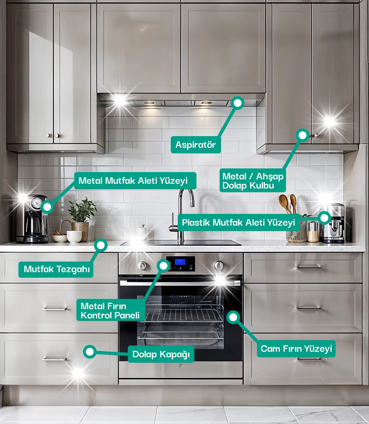 Mutfakta oluşan yapışkan lekeler, buhar kaynaklı yağ izleri ve el temaslı kirlerde yüksek etki. Yüksek çözücü formülüyle güvenli temizlik.