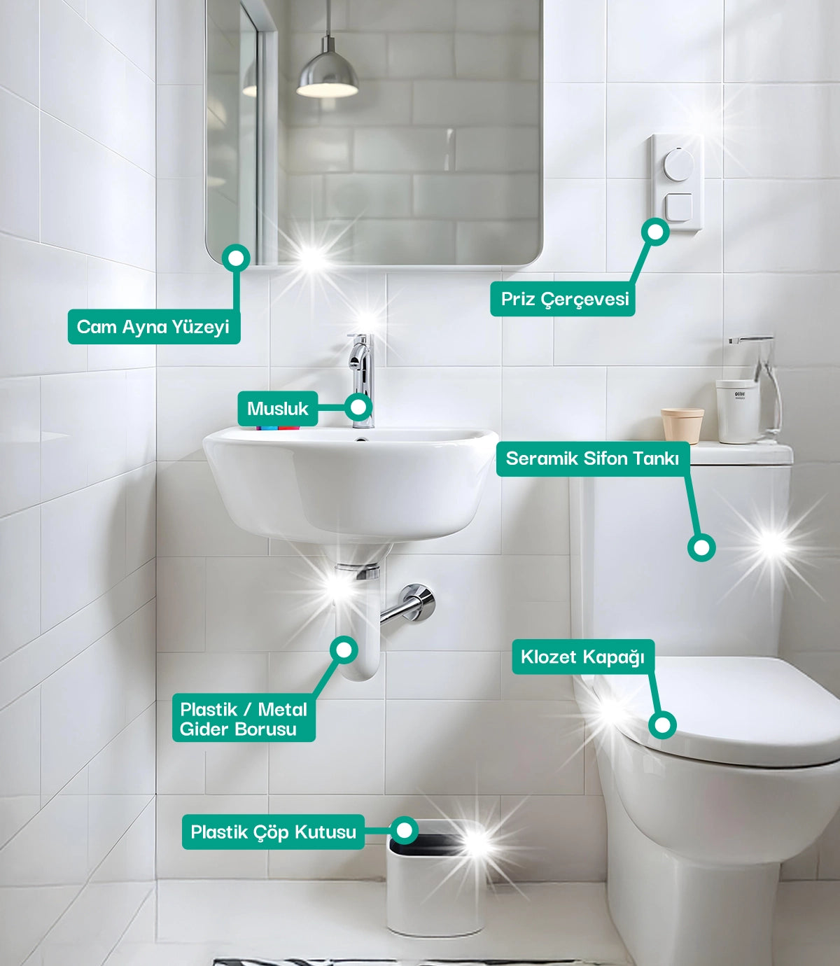 Su sıçraması, sabun kalıntısı ve plastik üzerindeki mikrop birikimlerine karşı etkili formül. Hijyen sağlarken yüzeylere zarar vermez.