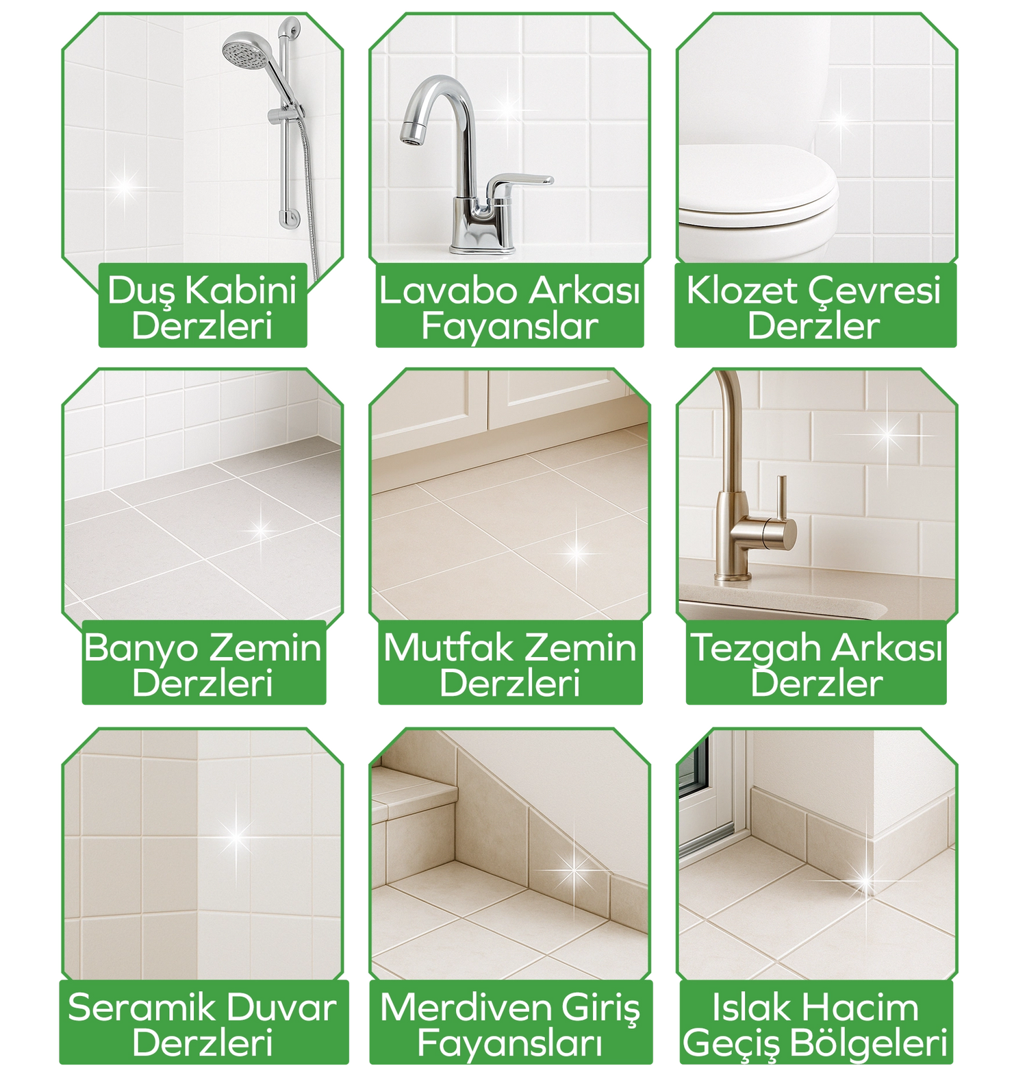 • Duşakabin Derzleri: Su ve sabun kalıntılarının oluşturduğu grileşmeyi ortadan kaldırır.