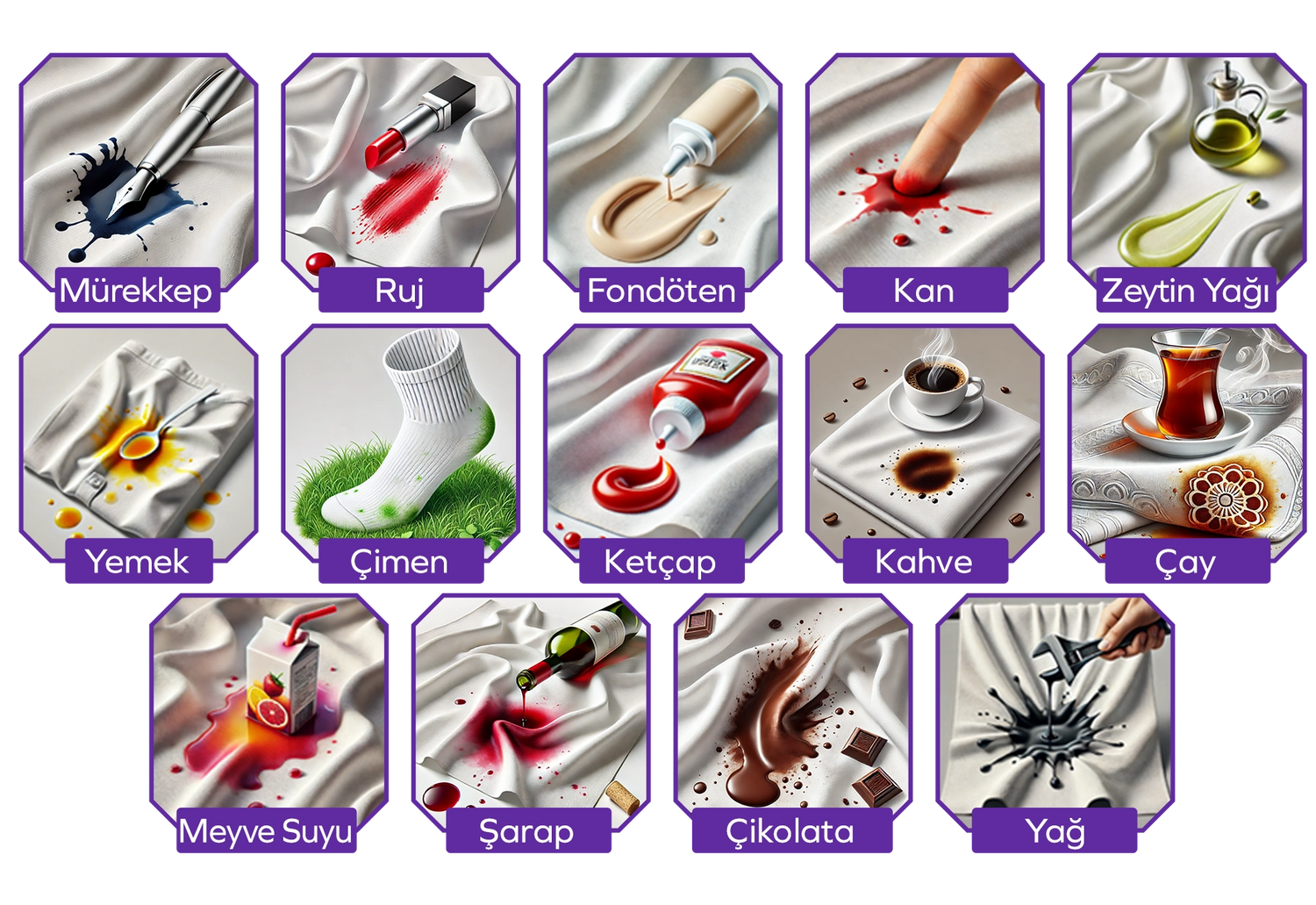 - Kıyafetler (Pamuk, Keten, Yün, Sentetik): Zorlu lekelerden narin kumaşlara kadar etkilidir.