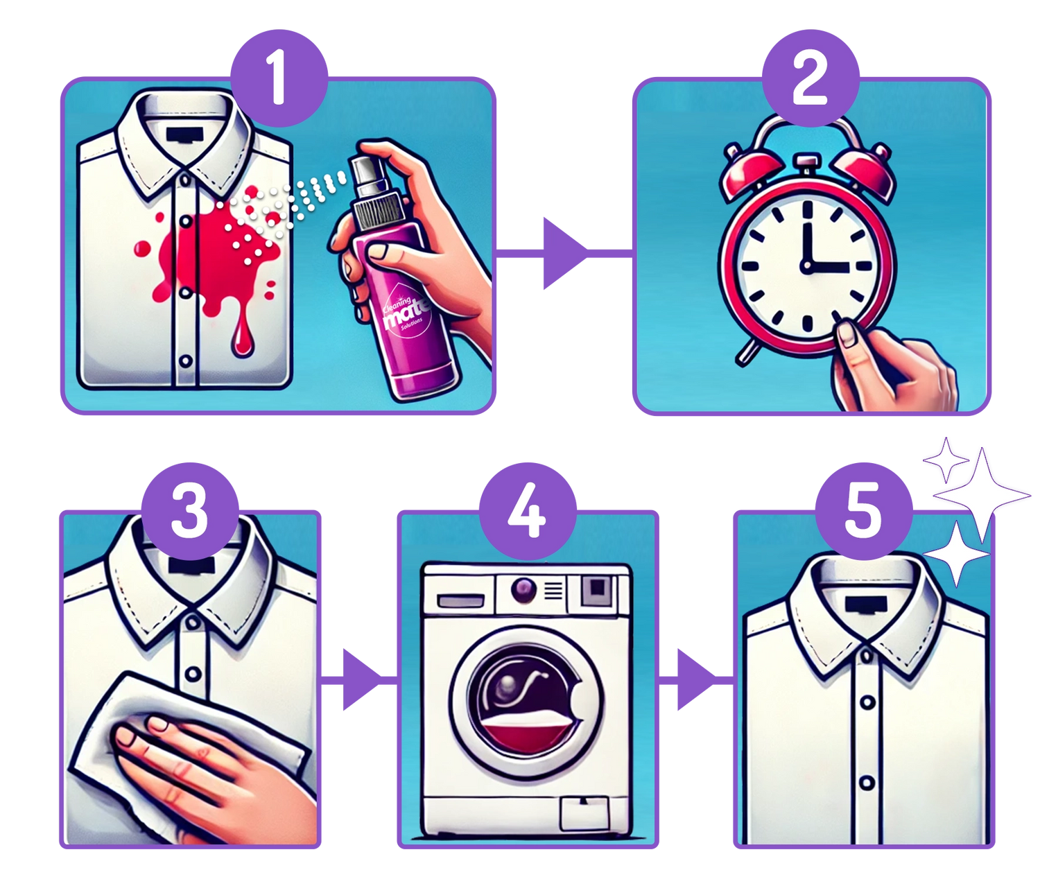 - Lekeye 2-3 fıs Leke Sihirbazı sıkın. Ürün, lekeye nüfuz etmesi için bir süre bekletilmeli.